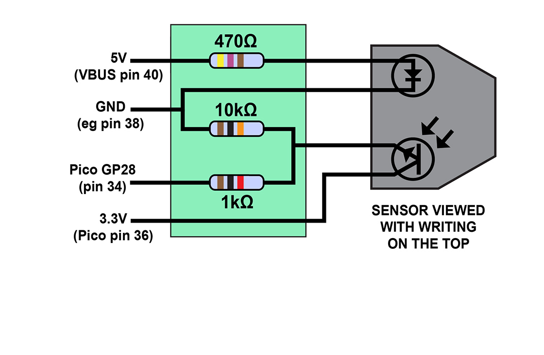 Below are links to the code, as well as the wiring diagrams, featured in this video. For the anemometer, please also see this page. Wiring for connecting the LCD module to the Pico: ![]() Wiring for connecting the switch module to the Pico. This wiring is in addition to the above for the LCD module. And note that, because I had the Pico in a breadboard, my VCC connection was actually to a rail on down the side of the breadboard, to which I had connected pin 36 (3.3V OUT): ![]() Wiring for connecting the reflective IR sensor to the Pico. Again note that, due to the use of the breadboard, some of my wiring was indirect, and that I ahd the resistors on a breakout board, as this is what I had constructed in my first anemometer build, as linked above: ![]() Return to: Videos Homepage.